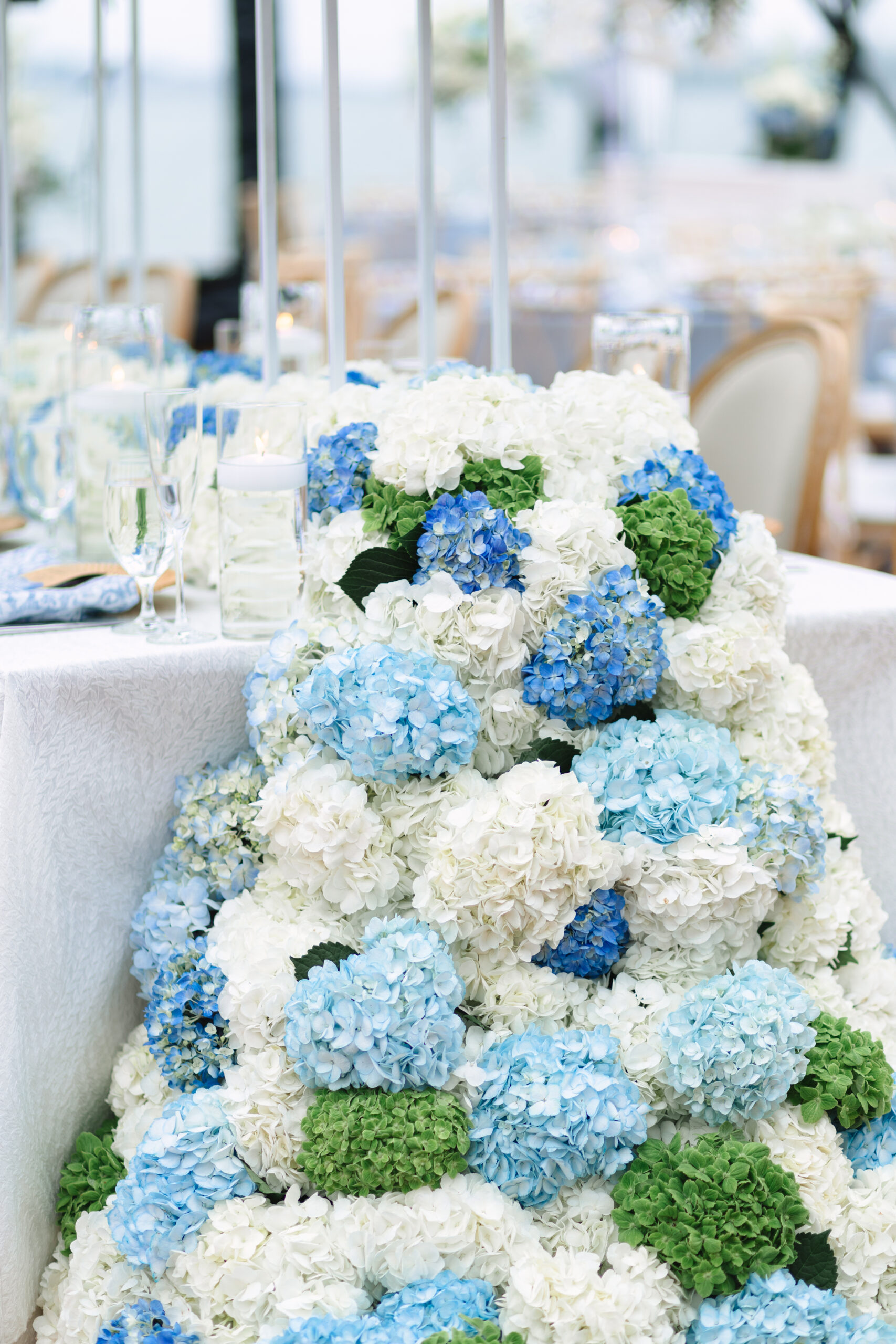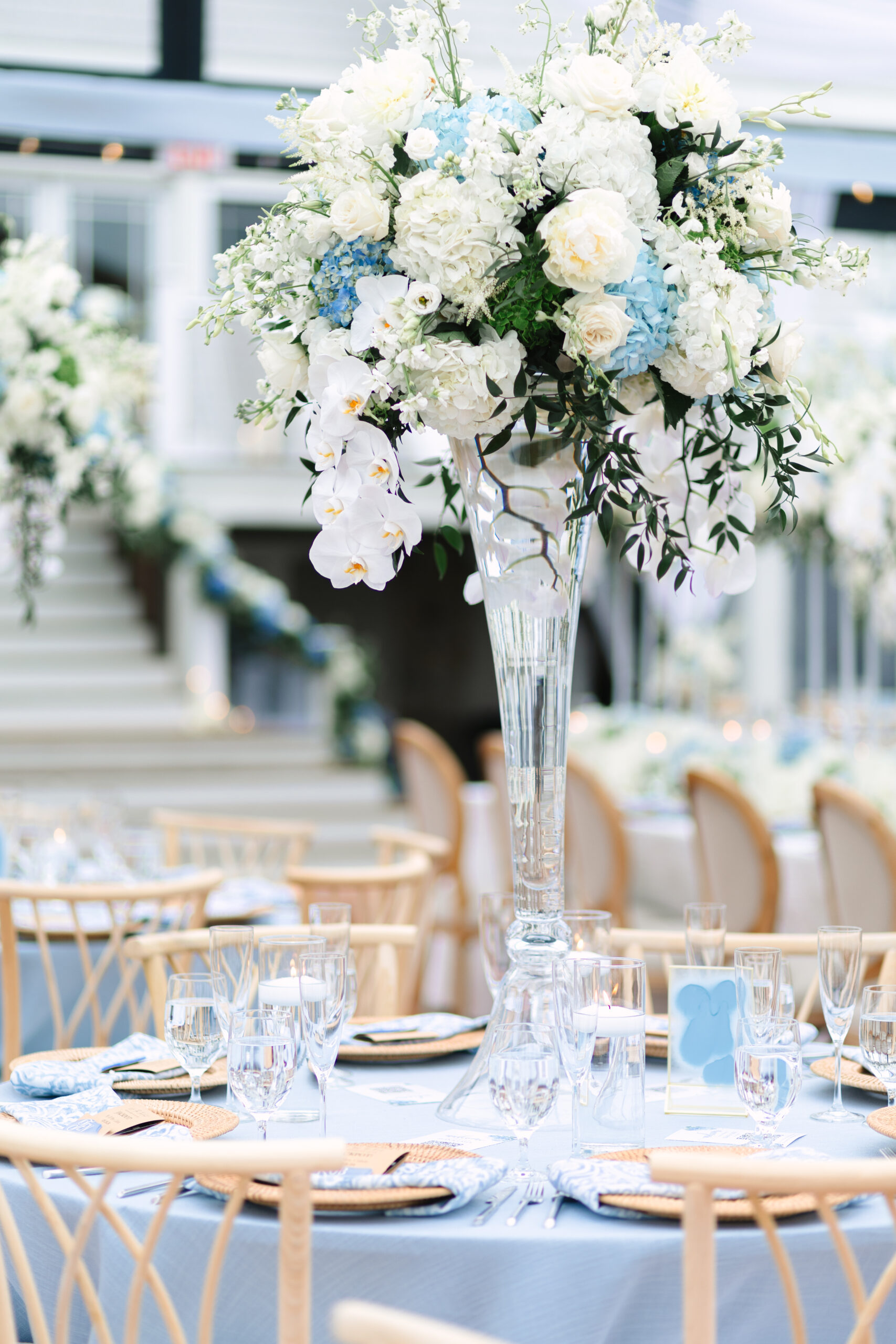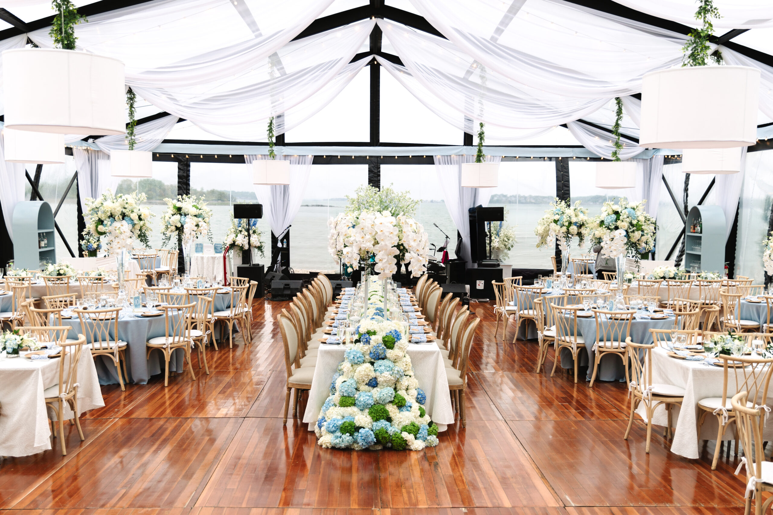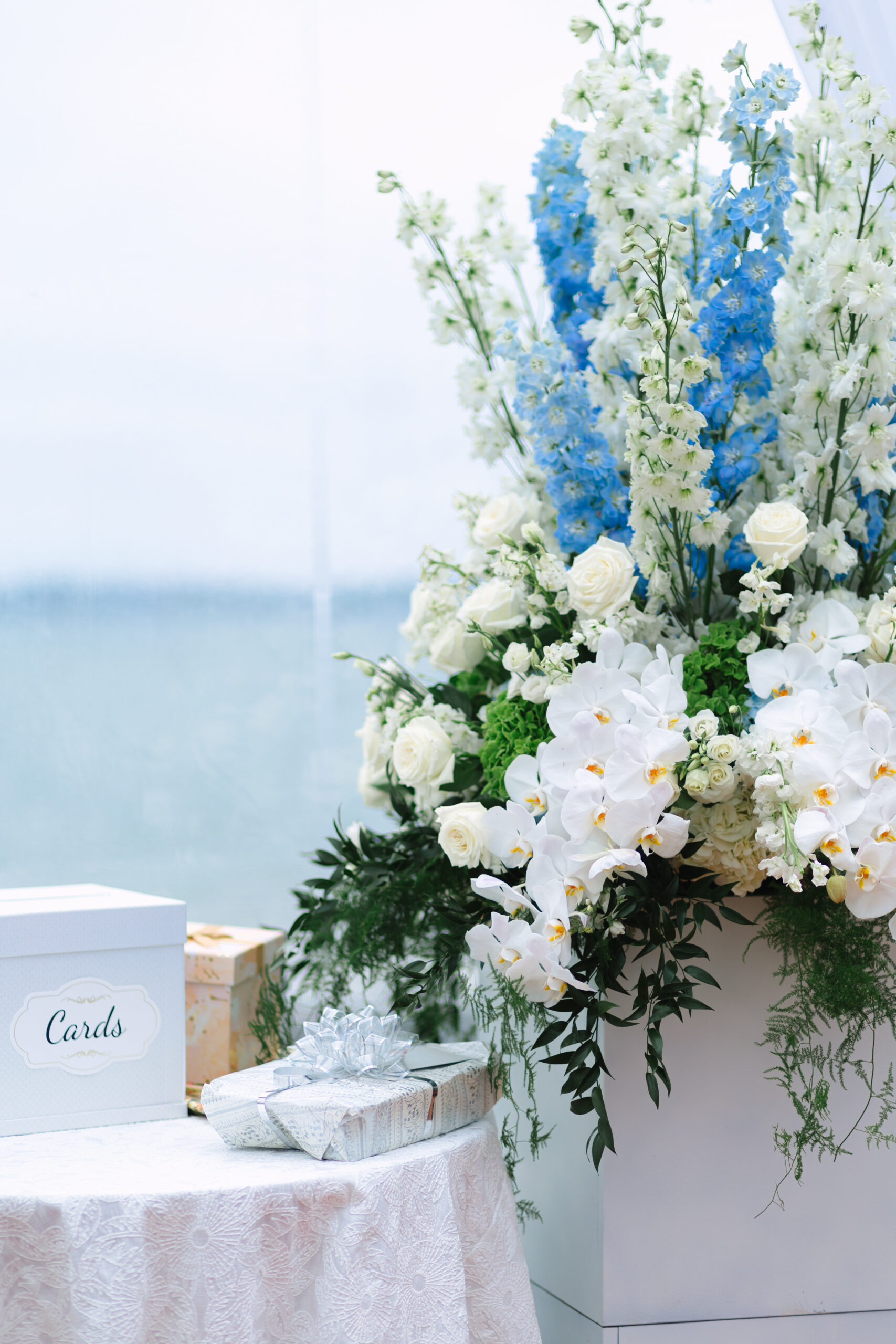For Casey and Sean’s coastal celebration, we designed a floral setting that felt airy, romantic, and perfectly in tune with the waterfront surroundings. Soft shades of blue, white, and green flowed throughout the space, with lush hydrangea, cascading orchids, and delicate blooms creating a sense of movement and natural elegance. The long dining table was a standout feature, with florals spilling down the center and pooling at the base like ocean waves. Paired with towering arrangements and soft draped fabric overhead, the entire space felt fresh, serene, and timeless—an ode to the beauty of the coast and the joy of the day.