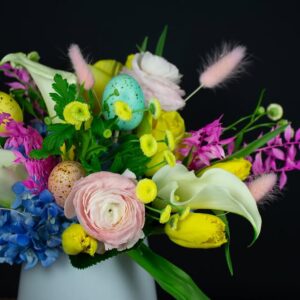 Celebrate the season of renewal and joy with a vibrant arrangement that’s bursting with springtime color. Featuring dreamy blue hydrangeas, cheerful yellow tulips and roses, and lush pink ranunculus, this design is a true springtime showstopper. Tucked among the blooms are playful, colorful eggs for that perfect Easter touch—all thoughtfully arranged in a modern 5×5 […]