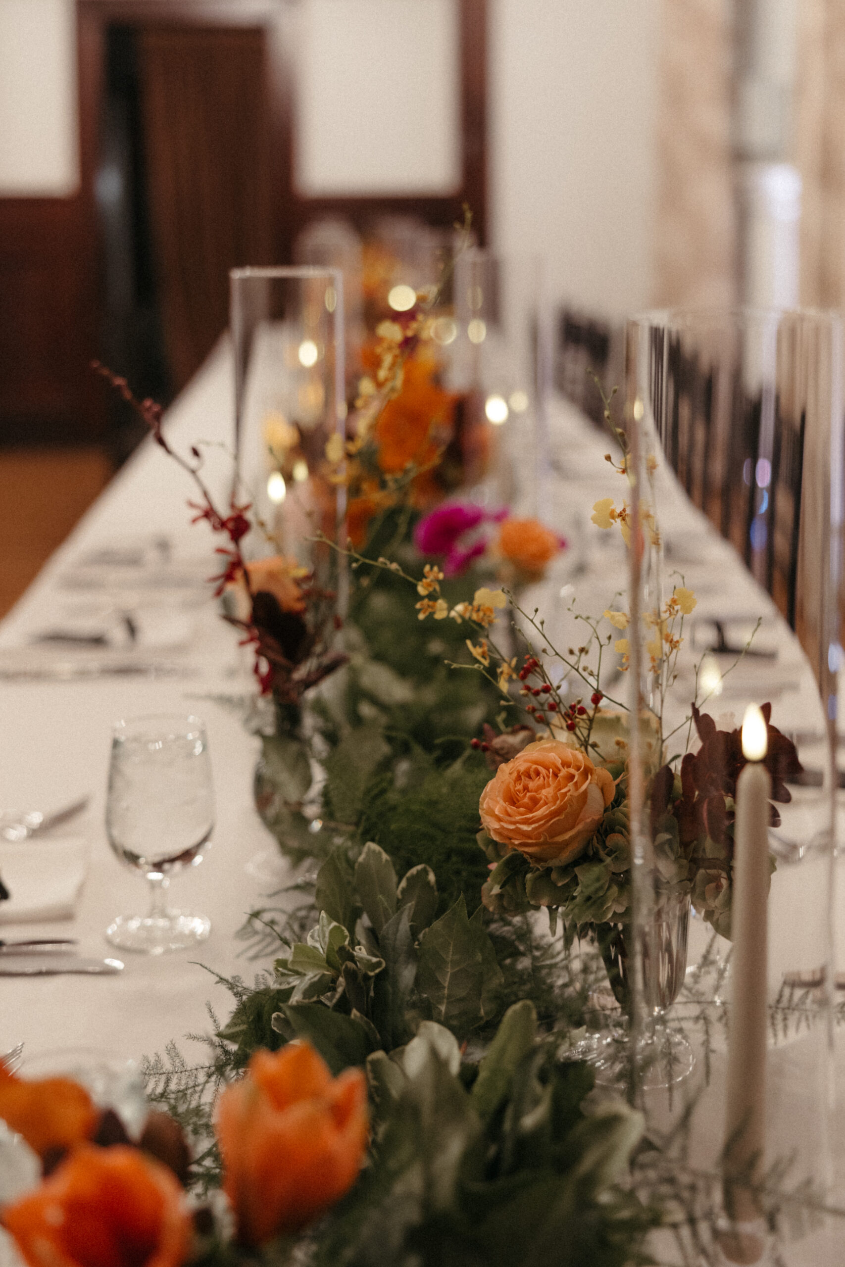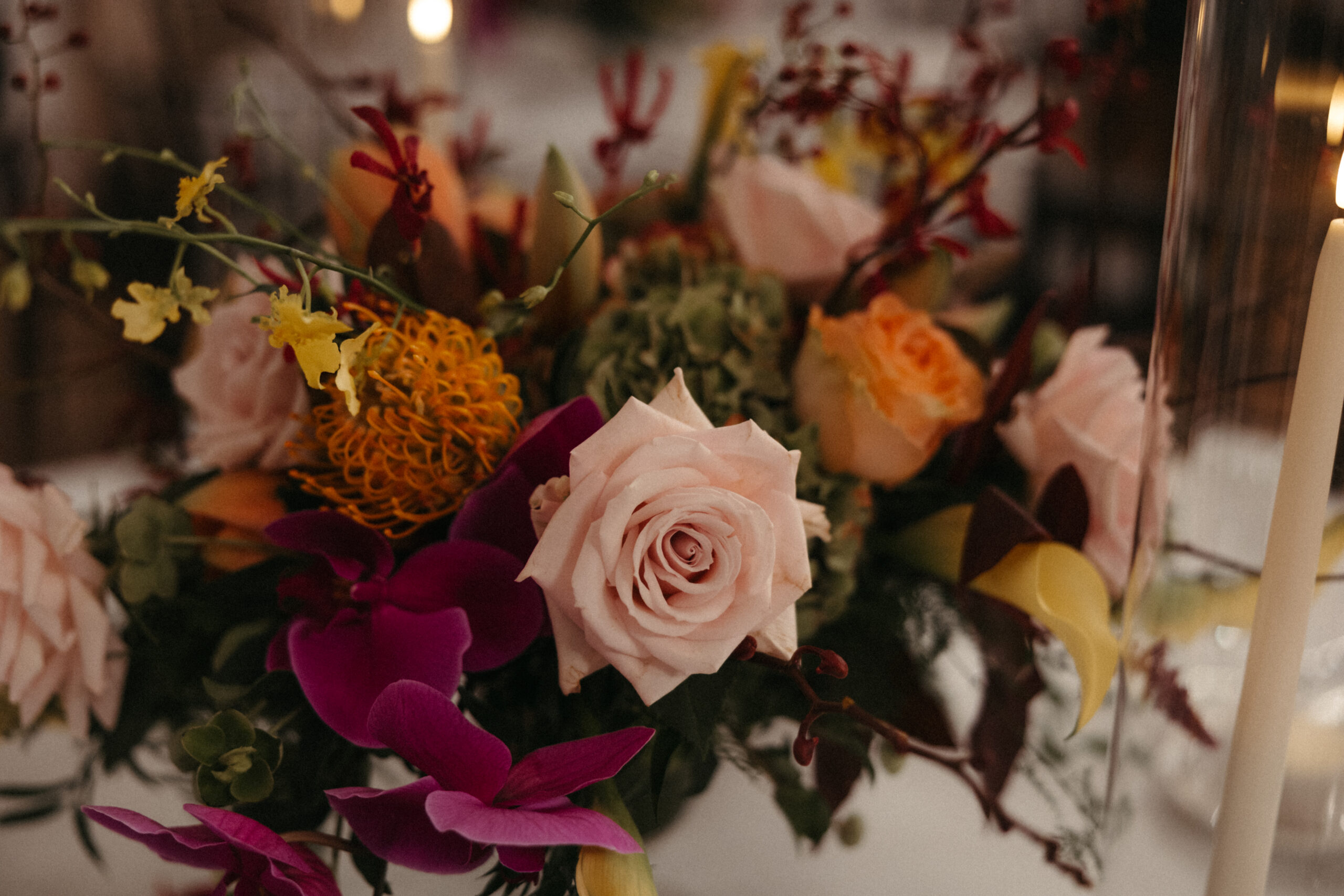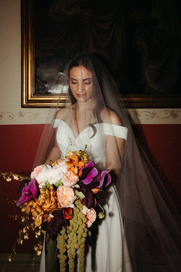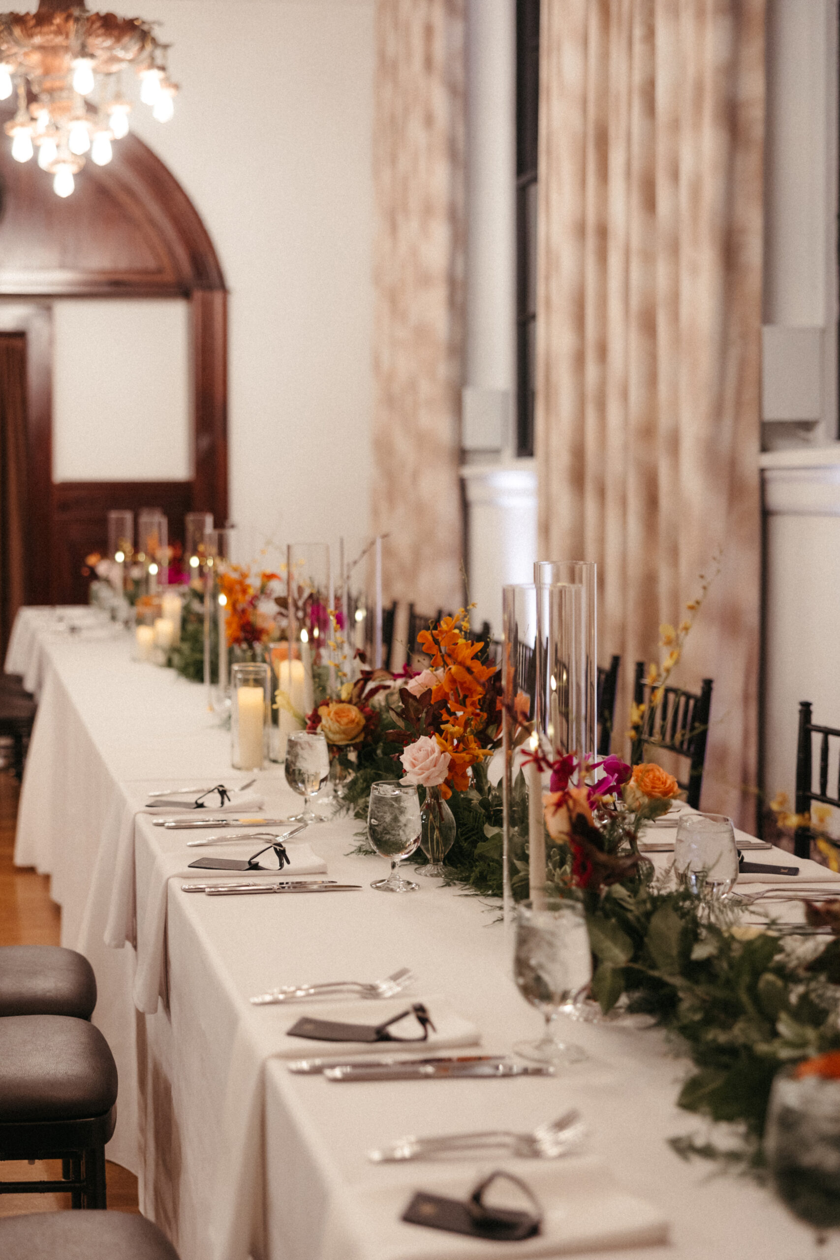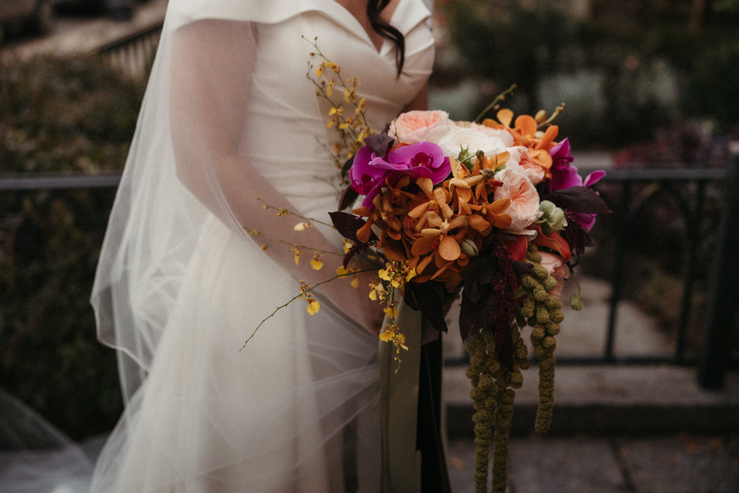 For Victoria and Ben’s fall wedding at The Tower: A Longwood Venue, Stapleton Floral designed a romantic and moody autumn-inspired floral palette accented with a lush mix of tropical orchids. The bridal bouquet featured blush garden roses, yellow Oncidium orchids, green and deep red hanging amaranthus, pops of orange orchids, and delicate purple Phalaenopsis orchids, creating a striking contrast against the rich, moody fall setting. Centerpieces and arrangements echoed this layered, textural mix, combining seasonal foliage with bold, tropical blooms to bring drama, depth, and warmth to the historic elegance of The Tower, making Victoria and Ben’s celebration truly unforgettable.