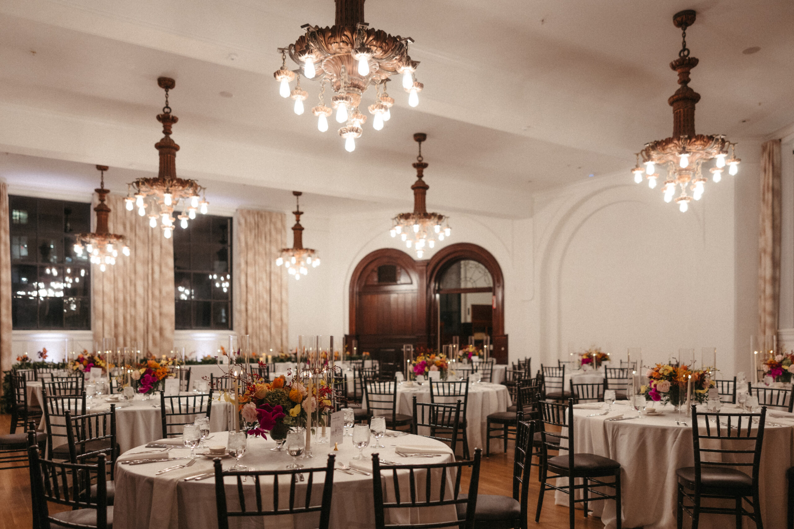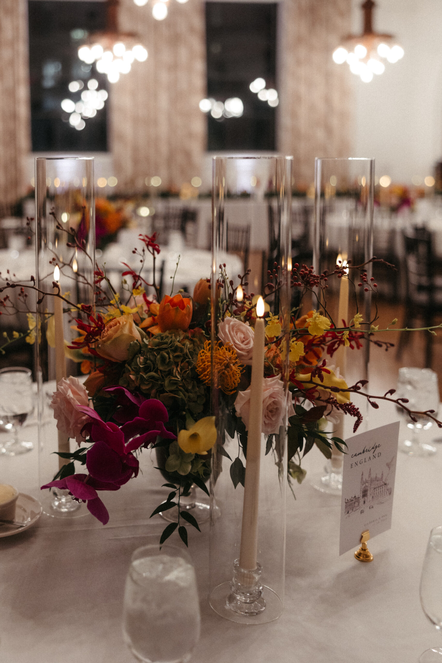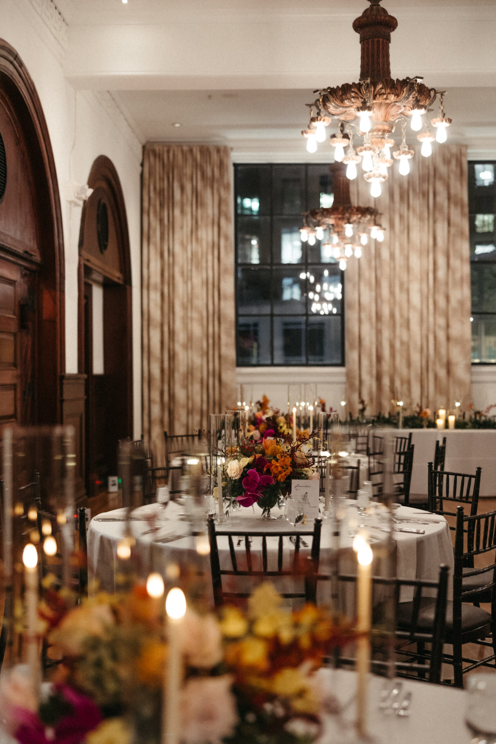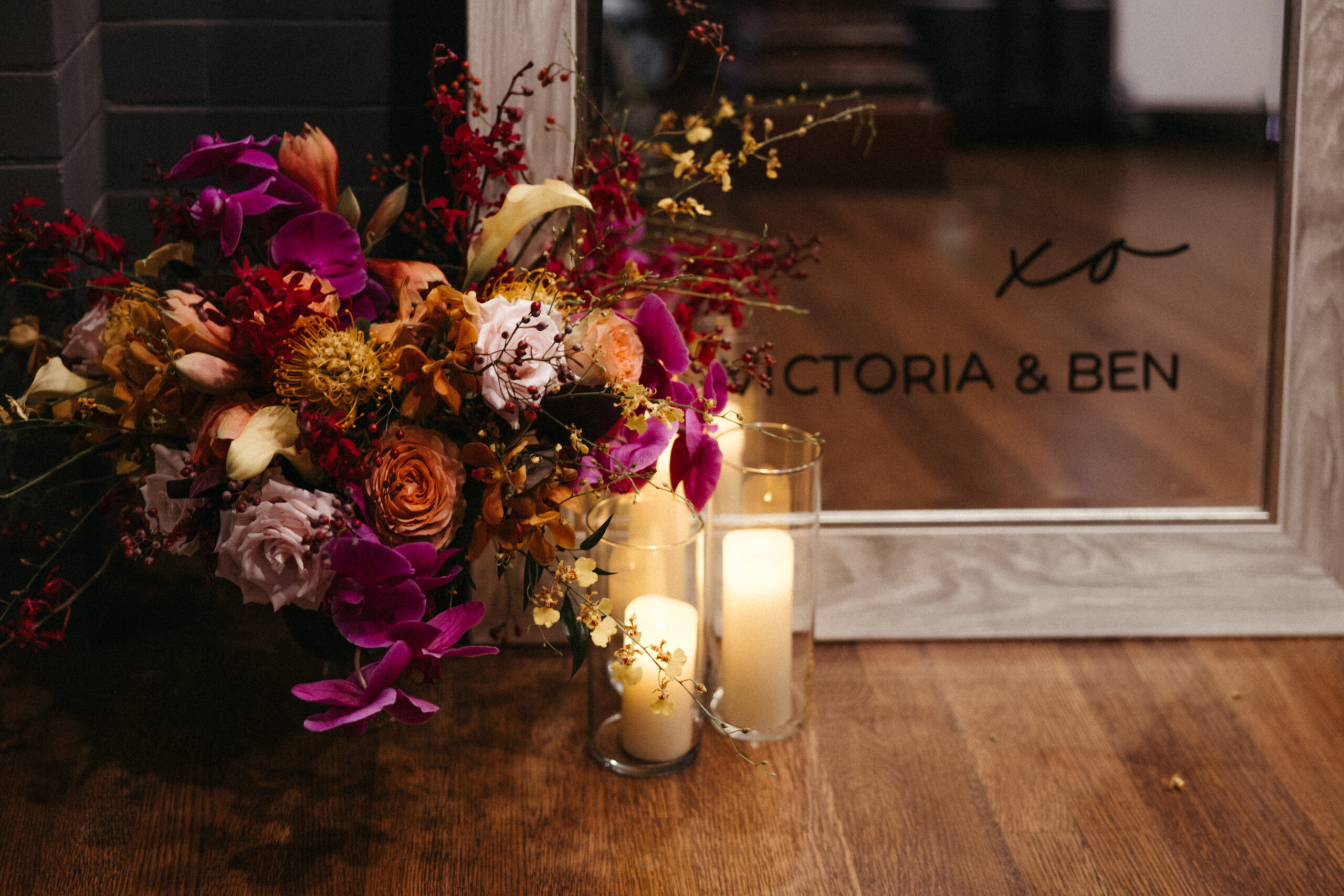 For Victoria and Ben’s fall wedding at The Tower: A Longwood Venue, Stapleton Floral designed a romantic and moody autumn-inspired floral palette accented with a lush mix of tropical orchids. The bridal bouquet featured blush garden roses, yellow Oncidium orchids, green and deep red hanging amaranthus, pops of orange orchids, and delicate purple Phalaenopsis orchids, creating a striking contrast against the rich, moody fall setting. Centerpieces and arrangements echoed this layered, textural mix, combining seasonal foliage with bold, tropical blooms to bring drama, depth, and warmth to the historic elegance of The Tower, making Victoria and Ben’s celebration truly unforgettable.
