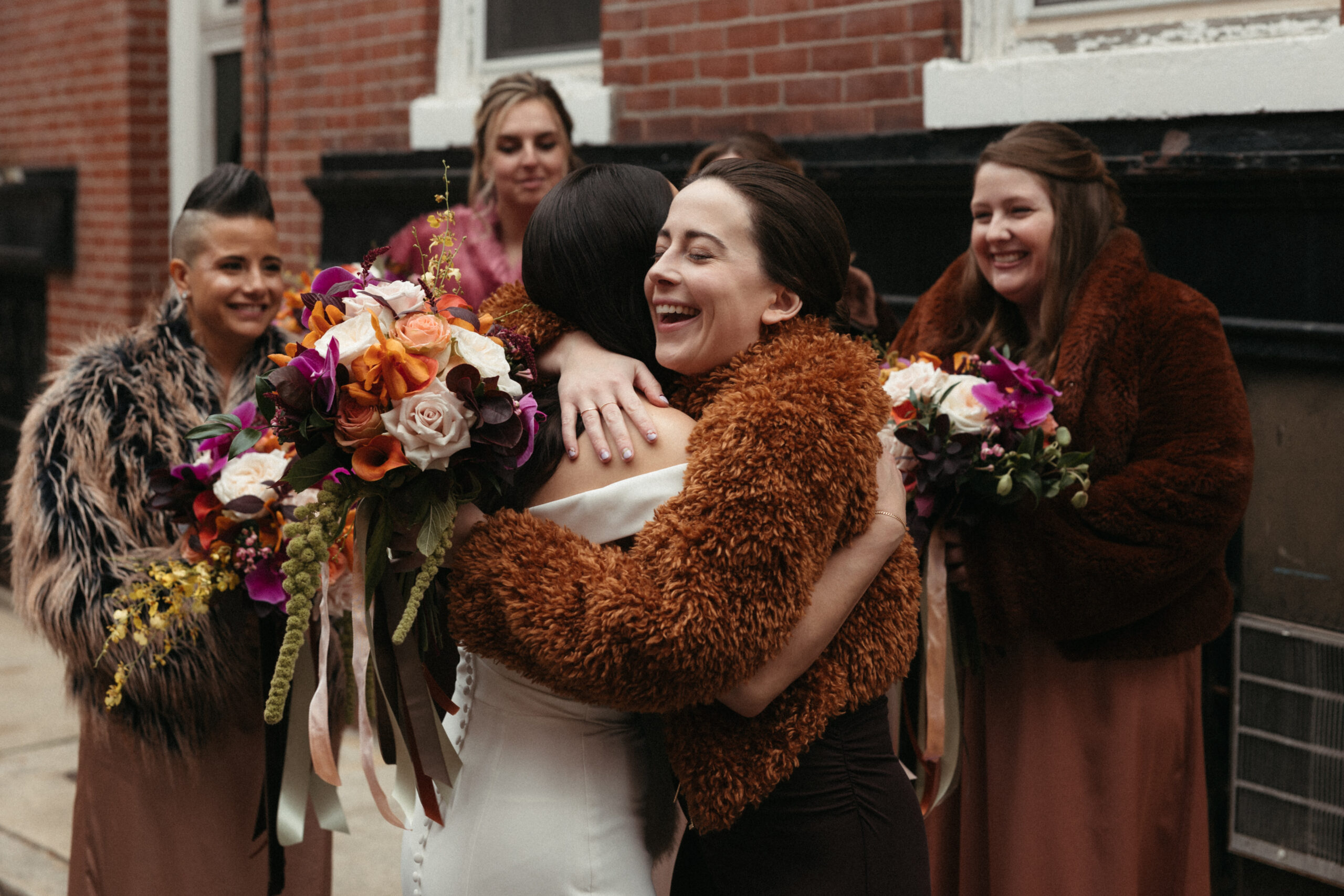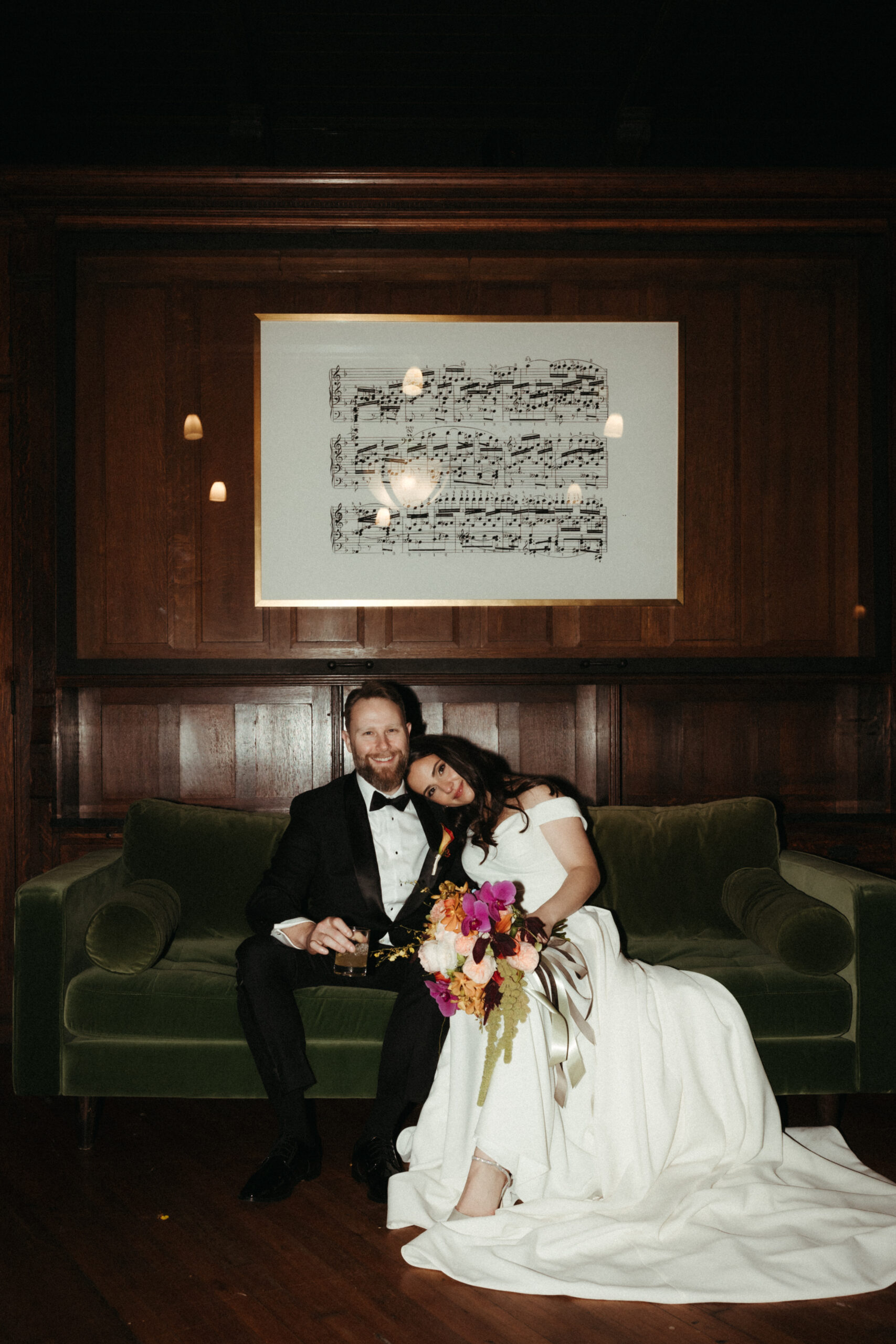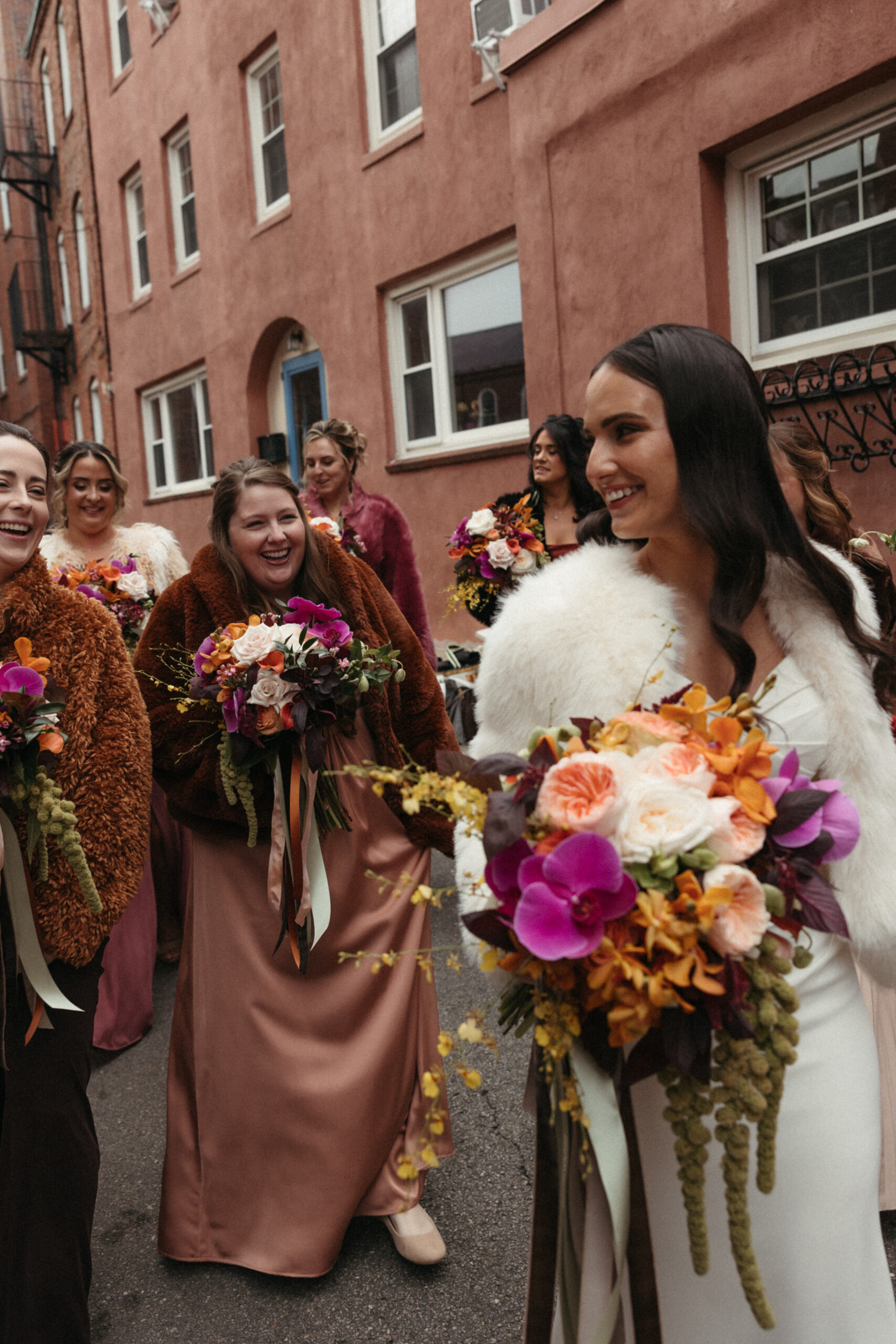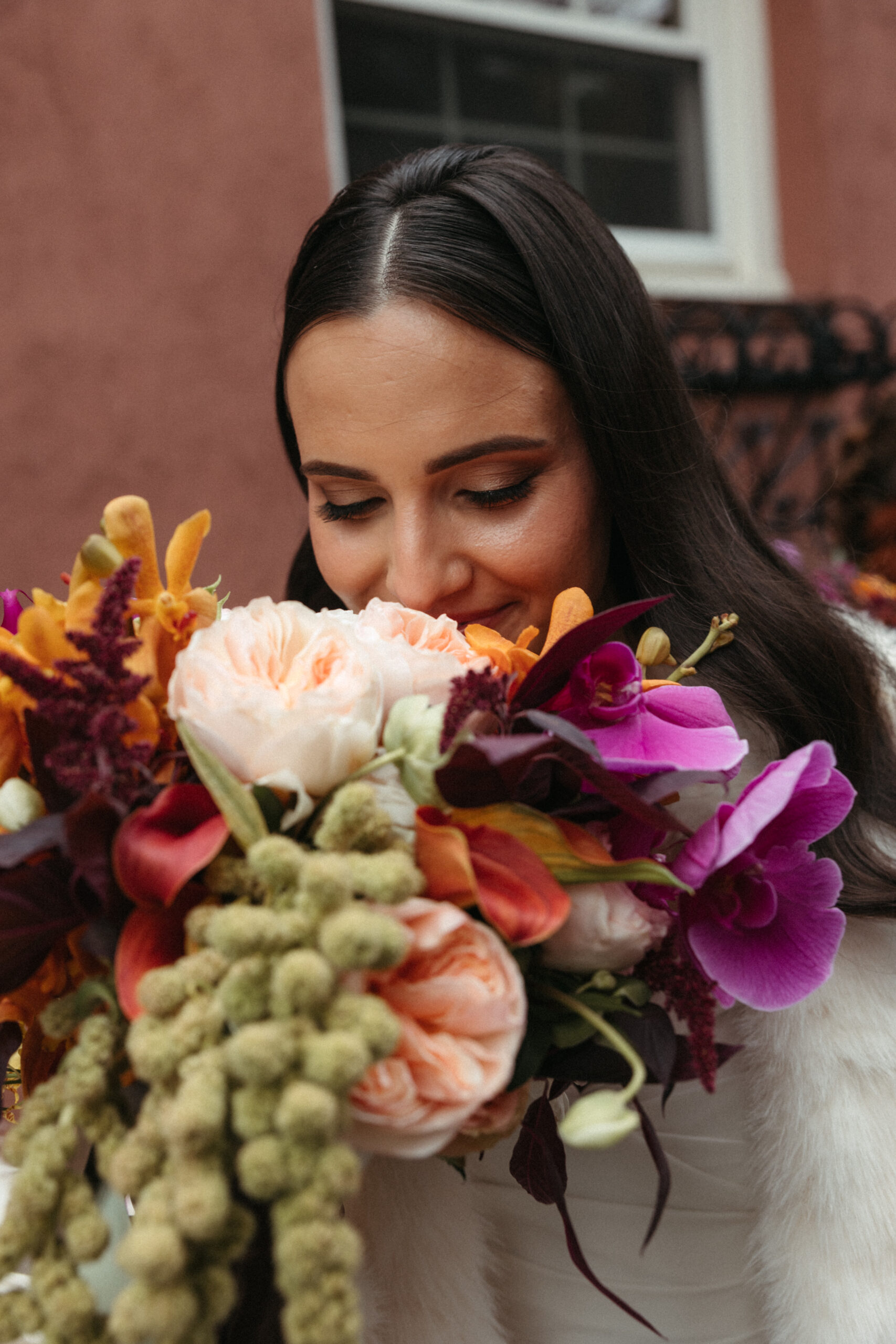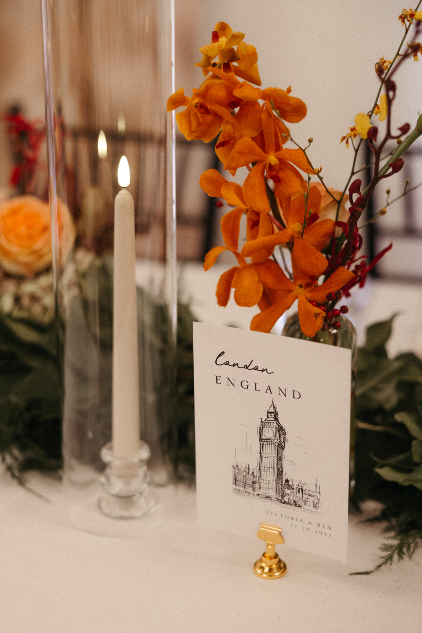 For Victoria and Ben’s fall wedding at The Tower: A Longwood Venue, Stapleton Floral designed a romantic and moody autumn-inspired floral palette accented with a lush mix of tropical orchids. The bridal bouquet featured blush garden roses, yellow Oncidium orchids, green and deep red hanging amaranthus, pops of orange orchids, and delicate purple Phalaenopsis orchids, creating a striking contrast against the rich, moody fall setting. Centerpieces and arrangements echoed this layered, textural mix, combining seasonal foliage with bold, tropical blooms to bring drama, depth, and warmth to the historic elegance of The Tower, making Victoria and Ben’s celebration truly unforgettable.